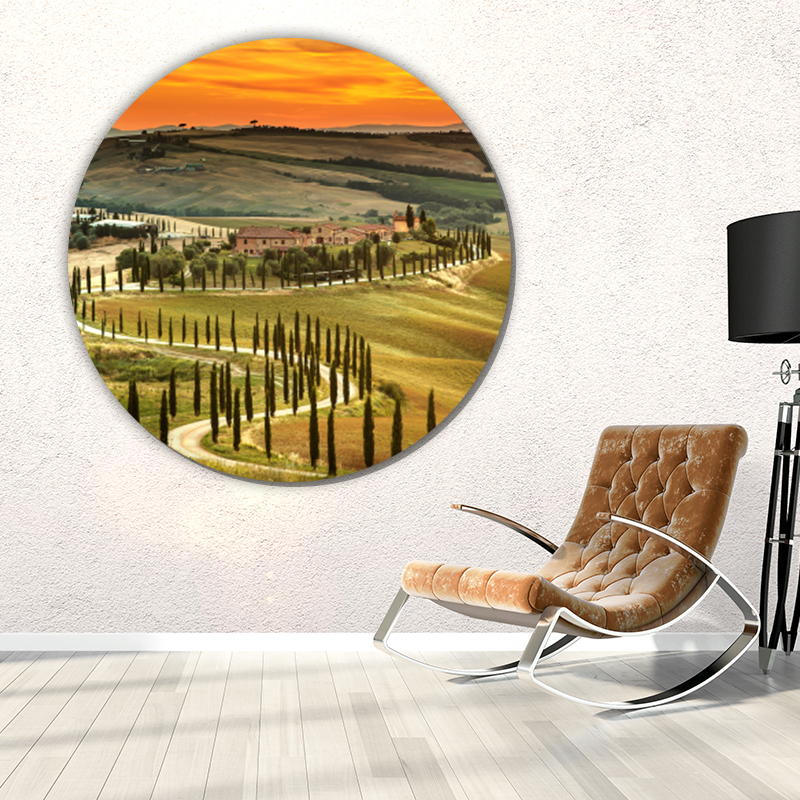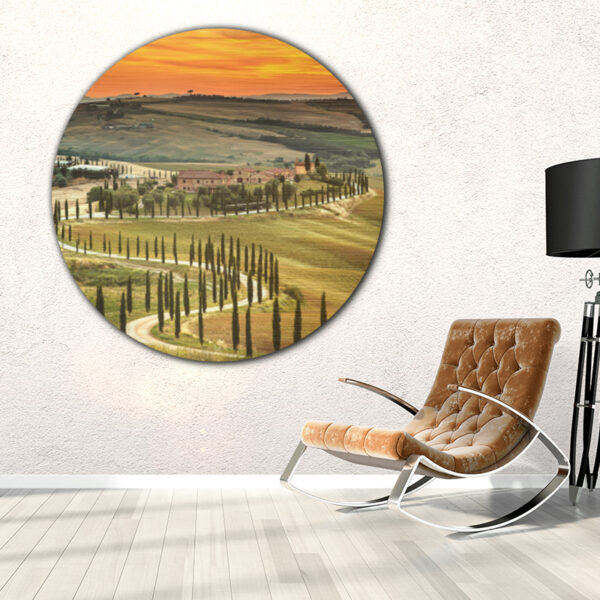 Dit landelijke tafereel van Toscane, Italië, ziet er echt schilderachtig uit. Ook geeft de geeloranje lucht het geheel een mystieke uitstraling. Deze wanddecoratie is ook leverbaar als liggende muurdecoratie. Als muurcirkel trekt de weg echter meer de aandacht. Bij ons kun je uit allerlei formaten en materialen kiezen. Laat je deze afbeelding op hout drukken dan past die bijvoorbeeld goed in een landelijk interieur. Kies je voor aluminium of plexiglas dan kan die ook goed in een modern interieur.