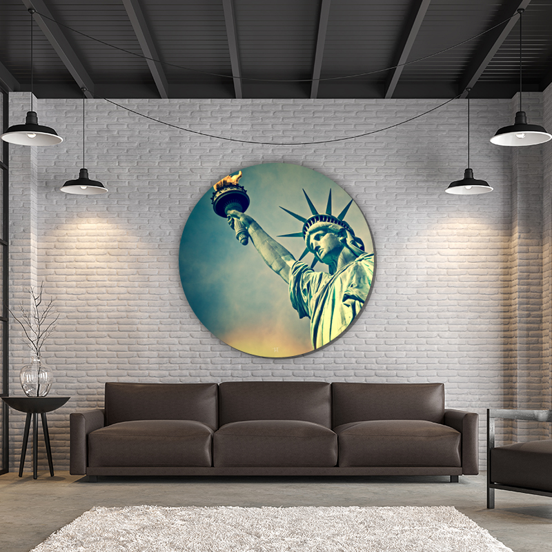 Het Vrijheidsbeeld aan de muur? Bij ToF aan je muur kan het. Je kunt dit bekende standbeeld bij ons als liggende en ronde  wanddecoratie bestellen. De uitsnede verschilt per vorm. Zo ziet deze afbeelding er als muurcirkel heel anders uit dan als liggende muurdecoratie. De Statue of Liberty staat in New York Bay en staat symbool voor de vrijheid, een van de kernwaarden van de Verenigde State. Naast het Vrijheidsbeeld verkopen we nog meer wanddecoraties van New York.