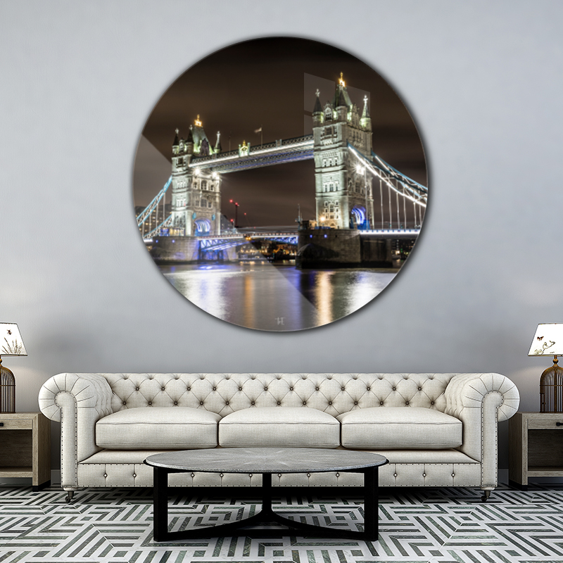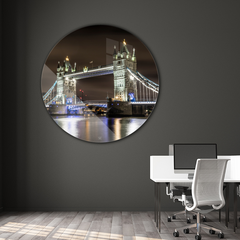 De Tower Bridge over de rivier de Theems in Londen bij nacht. Deze is leverbaar als ronde en liggende wanddecoratie. Ook kun je bij ons de ToF London at dusk kopen. Zo is er altijd wel een afbeelding die je aanspreekt. Wij kunnen al deze afbeeldingen op plexiglas, aluminium, hout en canvas drukken. Bij muurcirkels is canvas niet mogelijk. De Tower Bridge is een populaire attractie bij toeristen en ligt naast de Tower of London, waar de brug naar is vernoemd. De brug werd in 1894 voltooid. Wij verkopen ook de ToF Tower Bridge en skyline of London. Daarop is de Tower Bridge bij daglicht te zien.