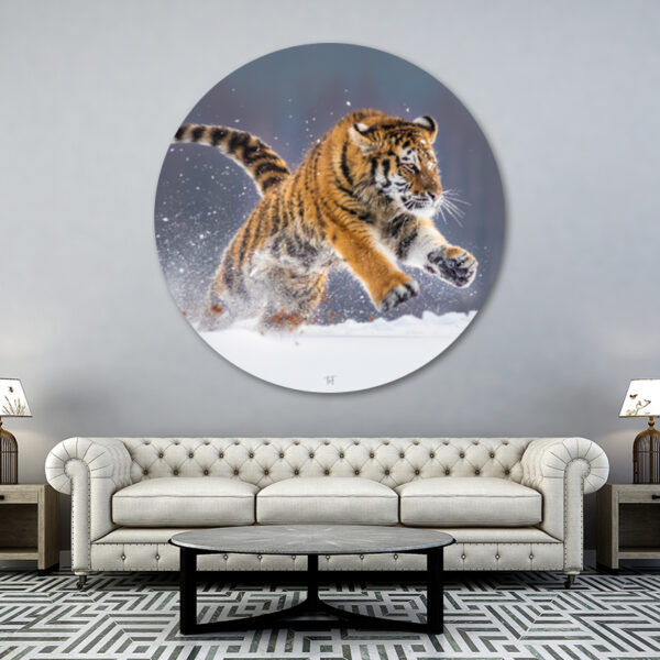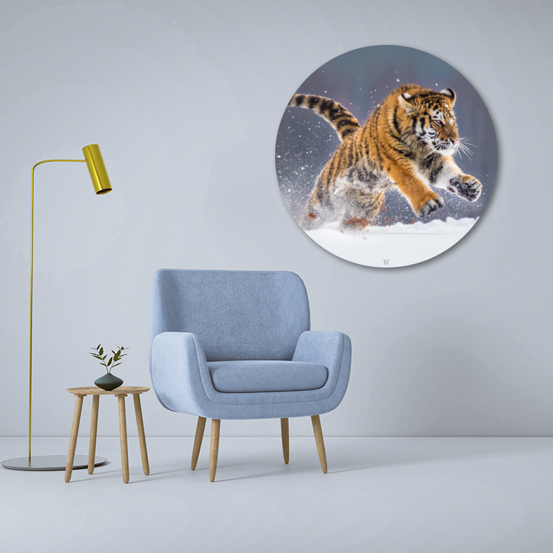 Op deze muurcirkel zie je een tijger die rondspringt in de sneeuw. Door de manier waarop die gefotografeerd is, lijkt het alsof hij de kamer inspringt. Door de ronde vorm wordt dat nog eens benadrukt. Met deze muurcirkel heb je echt een blikvanger in huis. Dus bestel ‘m snel. Deze prachtige muurcirkel is verkrijgbaar in verschillende afmetingen en leverbaar op 3 verschillende materialen: hout, aluminium en plexiglas. Ook is deze afbeelding verkrijgbaar als liggende wanddecoratie.