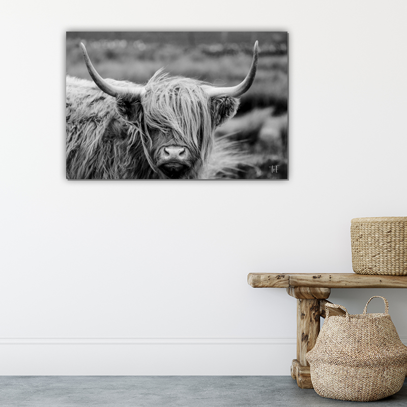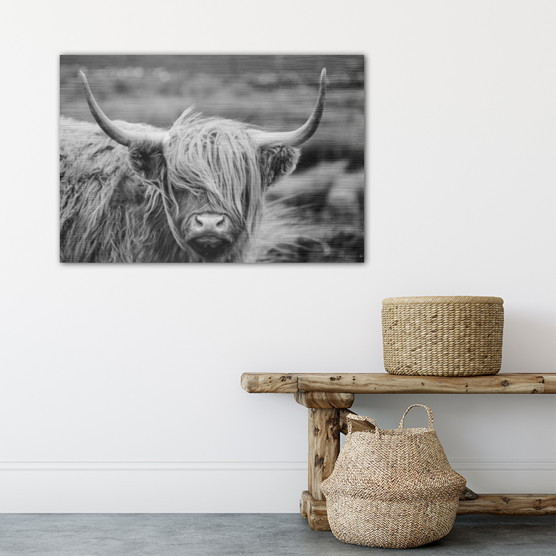 Op de wanddecoratie zie je de kop van een Schotse hooglander. Het dier heeft zijn kop naar je toegedraaid, maar doordat het haar voor de ogen hangt zie je die niet. Twee hoorns steken omhoog. Deze Schotse hooglander past goed in een rustiek en landelijk interieur. Vooral als je deze op hout of canvas laat drukken. Heb je een modern interieur, dan is plexiglas of aluminium mooier. Deze wanddecoratie is ook verkrijgbaar als muurcirkel.