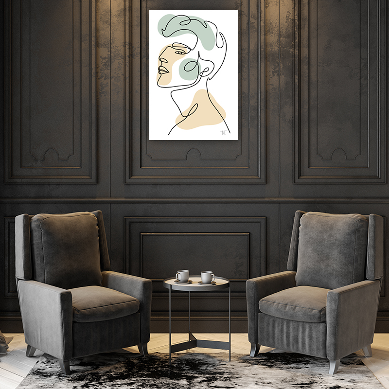 Wanddecoratie met een geïllustreerd portret van een man. Het portret bestaat uit een doorlopende zwarte lijn. In het gezicht is de kleur mintgroen en een zandkleur te zien. De achtergrond van de wanddecoratie is wit. Deze wanddecoratie kun je op verschillende materialen bestellen: plexiglas, aluminium, hout en canvas. Ook kun je uit allerlei maten kiezen en kun je deze afbeelding als muurcirkel kopen.
