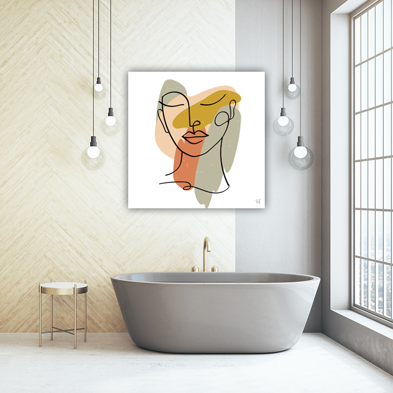 Wanddecoratie met een illustratie van een vrouwengezicht in abstracte stijl. Het gezicht op de illustratie is gevormd uit zwarte lijnen. De achtergrond van de wanddecoratie is wit. Achter het gezicht zijn kleurige vlakken aangebracht in de kleuren grijsbruin, lichtroze, okergeel en roodbruin. Deze wanddecoratie kun je op verschillende materialen bestellen: plexiglas, aluminium, hout en canvas. Ook kun je uit allerlei maten kiezen en kun je deze afbeelding als muurcirkel kopen.