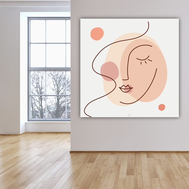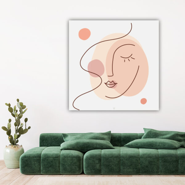Wanddecoratie met een vrouwenportret bestaande uit lijnen. Het gezicht is met een paar lijnen weergegeven, waarbij er een oog zichtbaar is, dat gesloten is. De achtergrond van de wanddecoratie heeft een lichte grijsgroenige kleur. In het gezicht zitten verschillende oranje en rode pastelkleuren. Het portret oogt erg minimalistisch, maar toch kun je er een gezicht in herkennen. Wil je deze wanddecoratie op jouw muur? Bij ons kun je uit meerdere materialen kiezen: hout, canvas, plexiglas en aluminium. Deze wanddecoratie is ook leverbaar als muurcirkel.